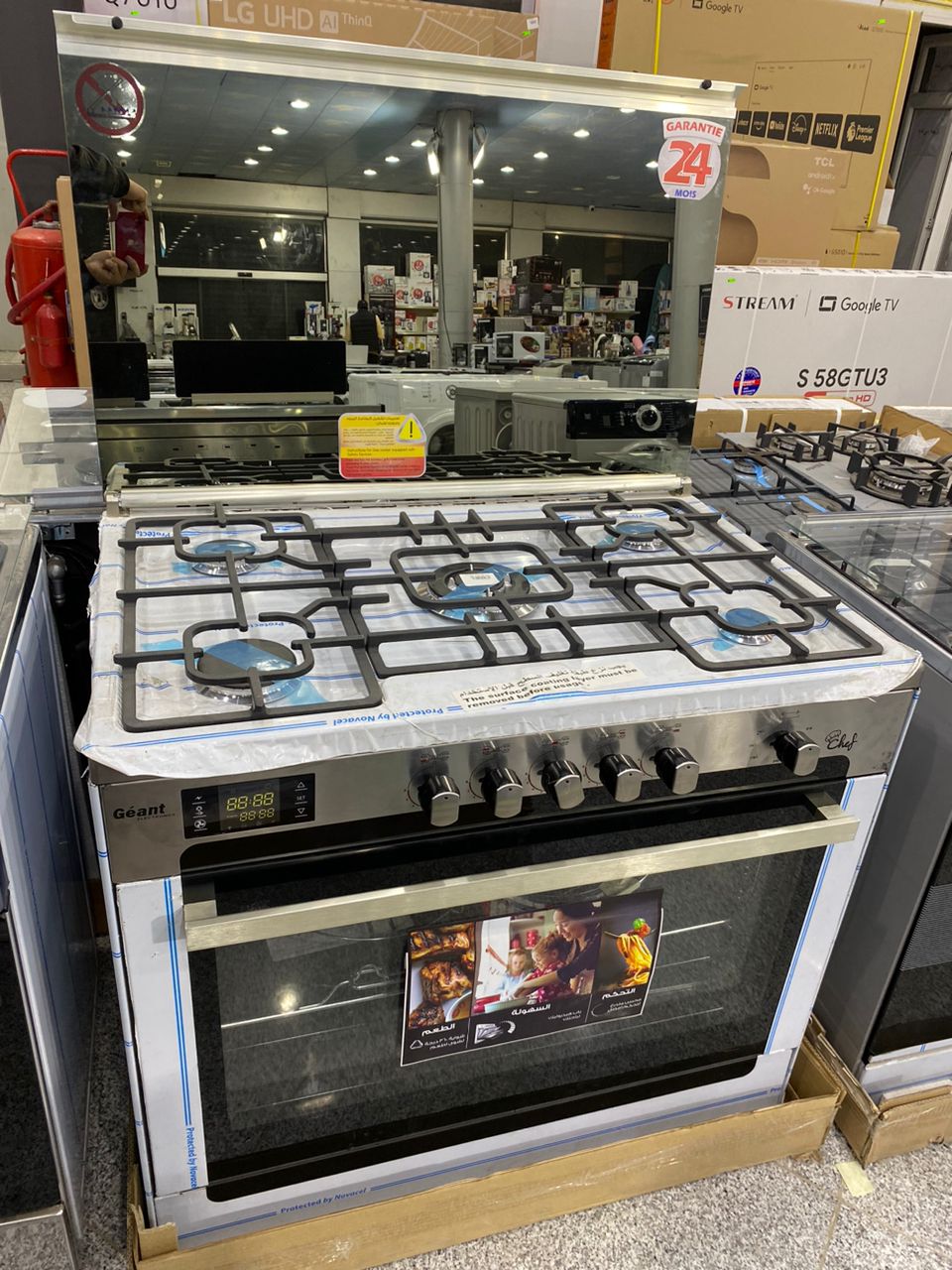 CUISINIERE GEANT CHEF 5 FEUX INOX MIROIR GAZ ELECTRIQUE CATALYSEUR VENTILE 60/80CM